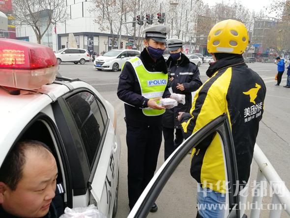 1月24日,在寒風(fēng)中執(zhí)勤的市公安局交通警察管理支隊直屬一大隊的交警收到美團(tuán)外賣送來的臘八粥。