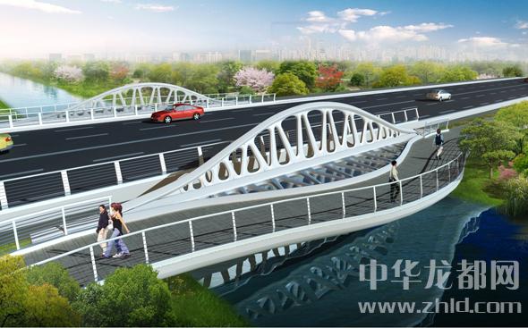 騰飛大道橋的設(shè)計(jì)方案有兩套,分別為“彩蝶飛舞”和“雙鳳呈祥”?!安实w舞”為下承式鋼管拱橋,寬36米。記者從效果圖中看到,橋兩側(cè)的拱圈,極具色彩感,給人一種賞心悅目的感覺?!半p鳳呈祥”為裝飾鋼管拱橋,寬36米。該橋采用“雙鳳”造型,象征天下太平,富含吉祥之意。