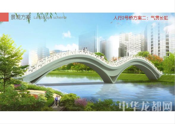 人行2號橋的設(shè)計(jì)方案有兩套,分別為“旭日東升”和“氣貫長虹”?!靶袢諙|升”為圓形塔懸索橋。記者從效果圖中看到,該橋的橋塔為圓形,猶如一輪東升的太陽,象征著城鄉(xiāng)一體化示范區(qū)蓬勃發(fā)展的未來?!皻庳為L虹”為中承式系桿拱橋。該方案結(jié)合中國玉帶橋的古典元素、抽象古典幾何美學(xué),采用現(xiàn)代的設(shè)計(jì)手法,創(chuàng)作出現(xiàn)代感和中國傳統(tǒng)橋梁元素雜糅的橋梁設(shè)計(jì)。