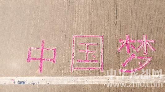 記者在現(xiàn)場(chǎng)看到,“中國(guó)夢(mèng)”三個(gè)字每個(gè)字高約30米,寬約23米,間隔約10米,筆畫(huà)寬約2米。為了讓字跡突出,他們把以前懸掛宣傳標(biāo)語(yǔ)的廢棄紅布條,鋪在麥茬上。一片金黃中,紅艷的字體格外奪目。