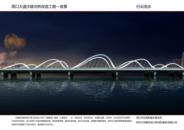 今后一個時期,結(jié)合水系的綜合治理,我市還將陸續(xù)開工建設(shè)數(shù)十座橋梁,并且秉承一橋一風格的設(shè)計特色,展示出每座橋梁的文化內(nèi)涵,通過幾年的努力,把周口中心城區(qū)打造成百座橋梁薈萃、風格各異、特色鮮明的橋梁博物館。