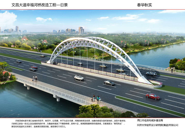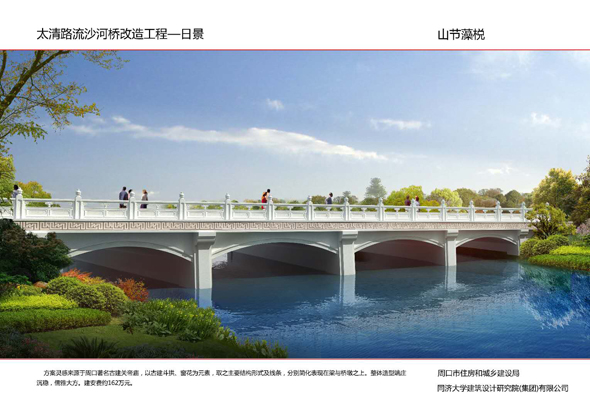 周口大道沙潁河橋景觀改造,設(shè)計造型簡單柔美,如行云流水,同時與沙潁河景觀帶相融合,給城市增添了生機與活力。周口大道賈東干渠橋以荷葉為設(shè)計元素,造型簡約而不失細節(jié)。周口大道流沙河橋造型簡潔大氣,線條流暢,像一條青龍游弋在水面上。文昌大道幸福河橋以花瓣、葉子為設(shè)計元素,造型豐富多彩。文昌大道流沙河故道橋在中分帶位置修建花壇,花壇造型莊重古樸,景石造型端莊沉穩(wěn)。太清路流沙河橋以古建斗拱、窗花為元素,造型儒雅大方。太清路洼沖溝2號橋以“輻轂相依”為名,既融合環(huán)境,又有團結(jié)、合作的寓意。太清路賈魯河橋,增加了景觀造型,使人們可以重溫當年賈魯河的美好畫卷。彭新莊橋以柳葉為元素,預示著留住賓客與送別親友的不舍之情的雙重含義。