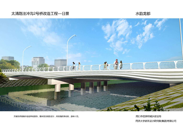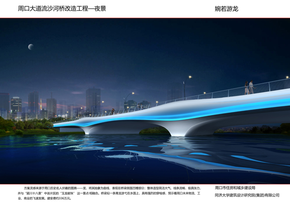 中原路跨沙潁河大橋,橋型采用下承式組合拱橋,遠看像一輪新月,展現(xiàn)出了“一輪明月照古城”的美景。洼沖溝政通路橋以”振翅高飛的翅膀“為造型元素,在新建人行道橋內(nèi)側(cè)采用鋼結(jié)構(gòu)塑造翅膀造型,同時對人行橋營造出廊道的意境。洼沖溝人和路橋以“太極魚”為設(shè)計元素,體現(xiàn)“天人合一”。流沙河騰飛路橋拱圈外傾,形似一只翩翩起舞的蝴蝶。流沙河大成路橋兼具現(xiàn)代鋼橋和傳統(tǒng)拱橋的美感,充分體現(xiàn)周口厚重的歷史文化。