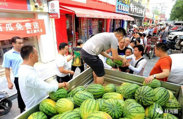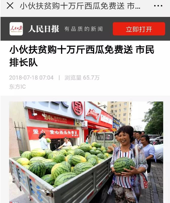7月18日,《人民日報(bào)》客戶端播發(fā)了“小伙購十萬斤西瓜免費(fèi)送 市民排長隊(duì)”的一條新聞,瞬間刷屏朋友圈,一天閱讀量就突破100萬人次,加上騰訊新聞、人民圖片截至19日發(fā)稿時(shí)閱讀量已達(dá)一百五十萬人次,評論13000多條,人們都在稱贊咱扶溝小伙宋鐵托的善舉,被網(wǎng)友稱他為“愛心西瓜哥”。