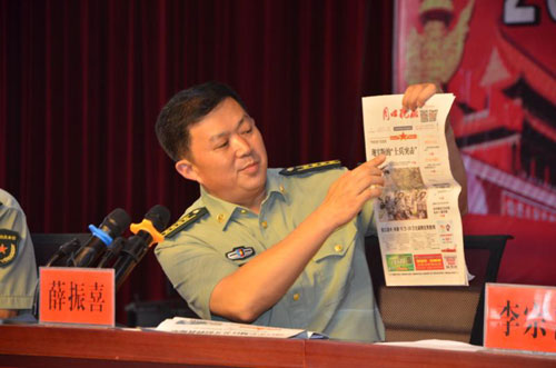 在當(dāng)天的動員會上,薛振喜副司令員手持《周口晚報》說,報紙上刊登的“周口好兵”系列報道,每一篇都是一個榜樣,每一篇都是一種激勵,希望在座的預(yù)征青年們到部隊后咬牙堅持、刻苦錘煉,打響周口好兵品牌,家鄉(xiāng)父老等著你們早立新功的喜訊。