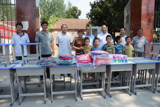 8月27日上午11時(shí)許,商水縣平店鄉(xiāng)大朱莊村小學(xué)大 門外,突然停放一輛廂式貨車??吹接袉挝凰蛠砹恕伴_學(xué)禮”,學(xué)校老師和學(xué)生滿臉興奮 、七手八腳和來人一塊卸下一些嶄新的課桌凳、書包文具等學(xué)習(xí)辦公用品。