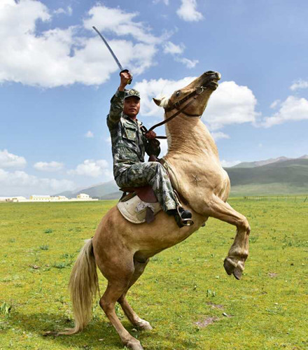 “一開始就‘認(rèn)慫’,哪還有一點(diǎn)騎兵精神可言?!壁w雪超暗自打氣。打那以后,趙雪超像根上緊的發(fā)條,和戰(zhàn)馬較上了勁。他晚上練劈刺,白天練馬術(shù)動(dòng)作,被馬一次次地摔下去,他拍掉身上的塵土又一次次地躍上馬背……就是憑借這股不服輸?shù)捻g勁, 3個(gè)月后,趙雪超的訓(xùn)練成績(jī)?cè)谶B隊(duì)名列前茅。