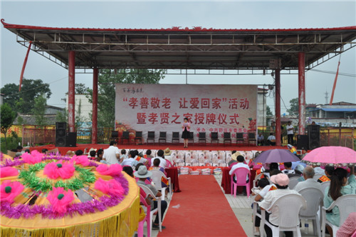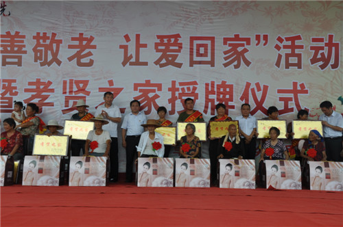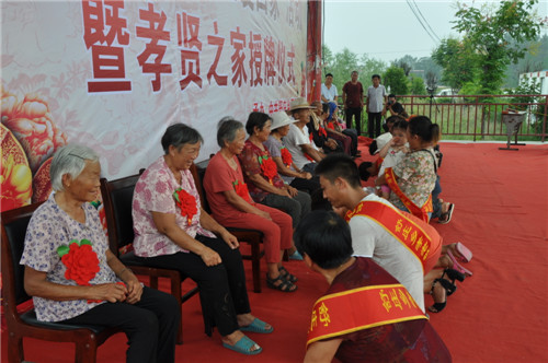 大會開始之前,來自該鄉(xiāng)20個行政村的廣場舞代表隊、戲曲代表隊、嗩吶代表隊先后出場,訾秀玲一曲《黃土高坡》贏得全場觀眾雷鳴般掌聲。緊接著,好兒子、好媳婦代表上臺為自己的父母磕了3個響頭,以表達對父母養(yǎng)育之恩的感激之情,老人們臉上流露出激動和幸福的淚水,現(xiàn)場掌聲經(jīng)久不息??h領導在主席臺上為36個孝賢之家授牌,并向獲獎者表示祝賀。據(jù)介紹,該鄉(xiāng)自開展孝善敬老接老人回家活動以來,已有200多名獨居老人被兒子、媳婦接回家居住。為了表彰接老人回家的好兒子、好媳婦和孝賢之家,該鄉(xiāng)組織、策劃了這次大型活動。