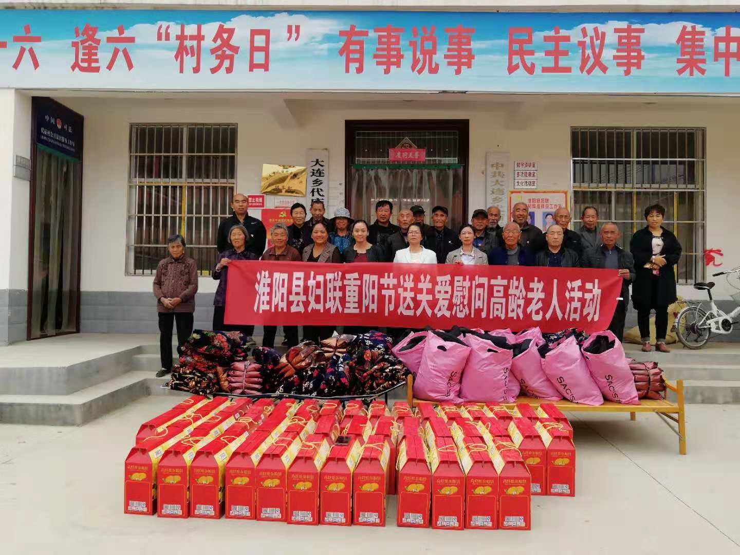 10月14日,淮陽(yáng)縣婦聯(lián)駐大連鄉(xiāng)代廟行政村工作隊(duì)在代廟村開展每月農(nóng)歷逢六主題黨日系列活動(dòng)。為進(jìn)一步深化黨性教育活動(dòng)效果,縣婦聯(lián)結(jié)合即將而至的重陽(yáng)節(jié),帶領(lǐng)黨員對(duì)全村43戶85歲以上高齡老人進(jìn)行了逐一看望慰問(wèn),為每位老人送上一套高級(jí)棉襖、棉被,一件高纖維雜糧餅和親切的節(jié)日問(wèn)候,共送去價(jià)值7000元的慰問(wèn)品。