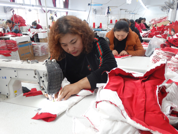 11月11日,沈丘縣周營鎮(zhèn)慧恩服飾來料加工點,當?shù)厥畮酌羰亍扒上眿D”正忙著加工訂單兒童冬季服裝。