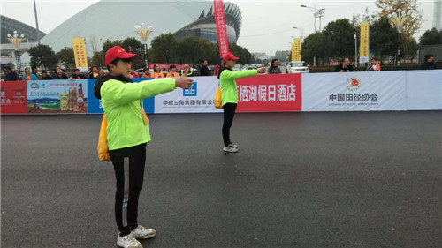 11月18日,在2018周口馬拉松暨善跑中國周口站現(xiàn)場,一個個身穿統(tǒng)一服裝的志愿者活躍在賽道之上,他們或給選手舉路線指示牌,或伸出大拇指給路過選手一個大大的“贊”,成為賽場內(nèi)外一道靚麗的風景。