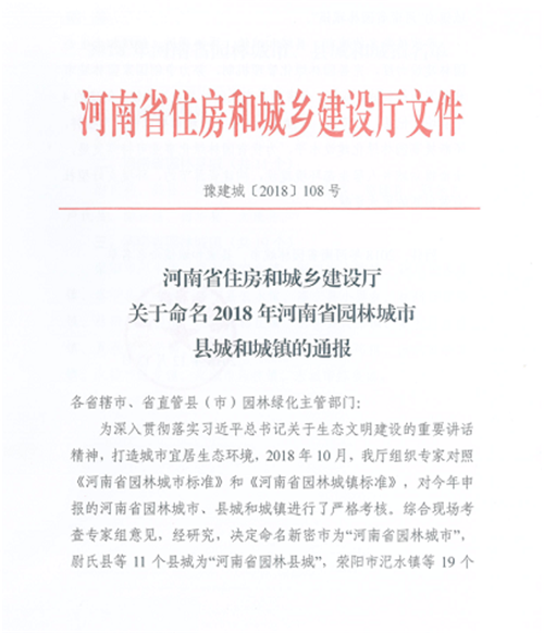 其中,新密市1地被命名為河南省園林城市,太康縣、西華縣、尉氏、淇縣、延津縣、原陽縣等11個(gè)縣被命名為河南省園林城市,登封市宜化鎮(zhèn)、新密市大隗鎮(zhèn)、新鄭市薛店鎮(zhèn)等19個(gè)鄉(xiāng)鎮(zhèn)被評為河南省園林城鎮(zhèn)。