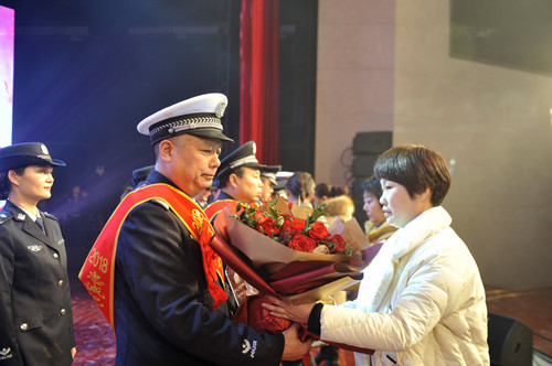 晚會(huì)現(xiàn)場(chǎng),頒獎(jiǎng)環(huán)節(jié)和文藝節(jié)目輪番呈現(xiàn),精彩紛呈。由32個(gè)民警子女上演的情景劇《天之大》,警寶們用稚嫩的聲音唱出了警察家庭的付出和他們對(duì)父母的愛,讓現(xiàn)場(chǎng)觀眾流下感動(dòng)的淚水;最后一個(gè)頒獎(jiǎng)環(huán)節(jié),當(dāng)15名警嫂手捧鮮花獎(jiǎng)杯走上舞臺(tái)為他們從警10年、20年、30年的愛人頒獎(jiǎng)時(shí),整個(gè)舞臺(tái)愛意濃濃。