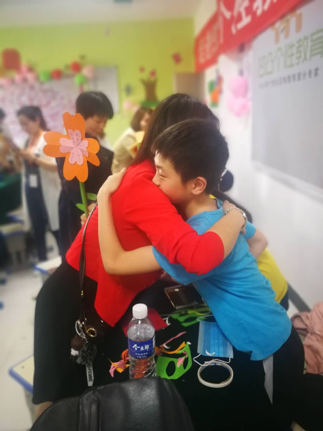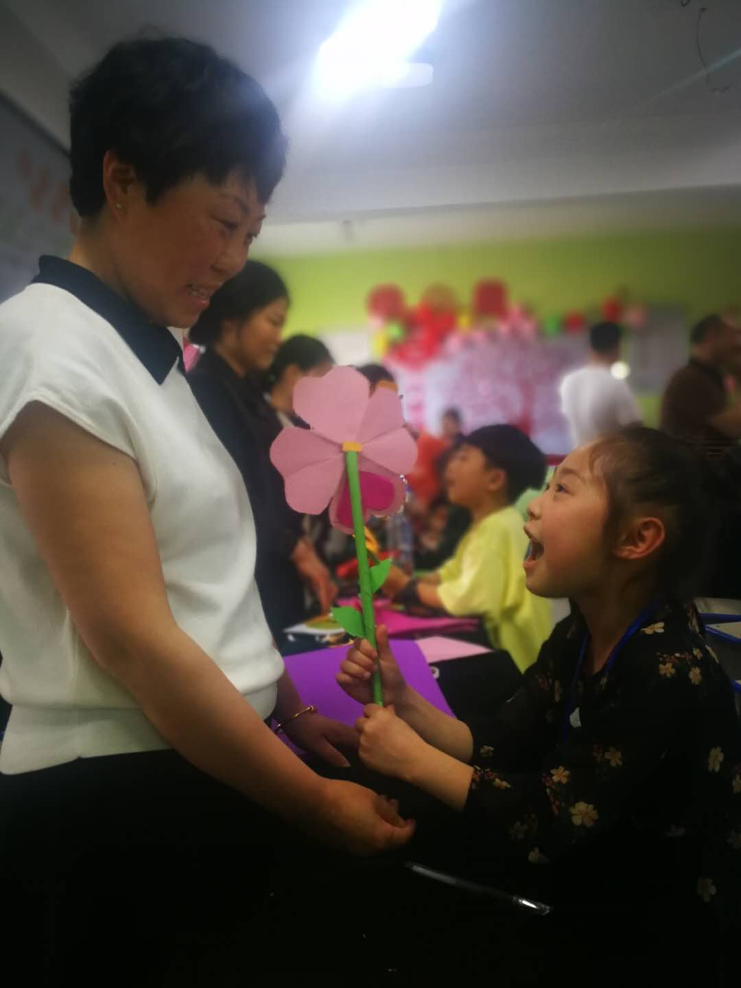 活動上,在專業(yè)手工教師的指導(dǎo)以及媽媽的配合下,這些小記者自己動手利用剪刀、雙面膠、彩紙等學(xué)習(xí)制做康乃馨紙花。五層紅色的花瓣、兩片綠葉、一根花枝,經(jīng)過近一個小時的反復(fù)實踐,一朵朵紙花陸續(xù)制好,成功的喜悅映紅了孩子們的笑臉。在祝??ㄆ蠈懴聦寢尩淖8UZ后,孩子們手捧用彩紙包裝好的紙花,拿著祝??ㄋ偷侥赣H手中,和媽媽熱情擁抱、向媽媽表達(dá)愛的祝福。