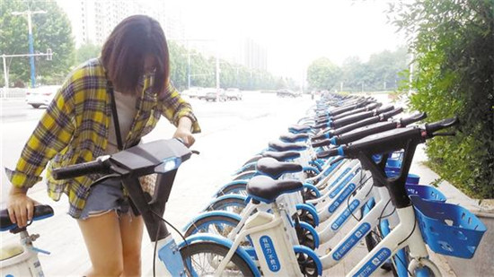 6月19日,一位市民在周口師范學院南門掃單車出行。