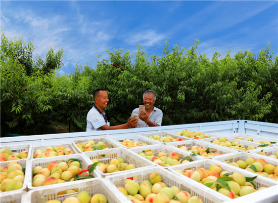 6月19日,在萬(wàn)畝桃園里,桃農(nóng)臉上洋溢著收獲的喜悅,看見(jiàn)記者拍照,熱情地從籃里桃了一個(gè)又大又紅的鮮桃遞給記者品嘗(圖一)。一名慕名而來(lái)的游客購(gòu)買(mǎi)了十幾斤鮮桃后掏出手機(jī)掃描桃農(nóng)的手機(jī)微信收款碼支付(圖二)。