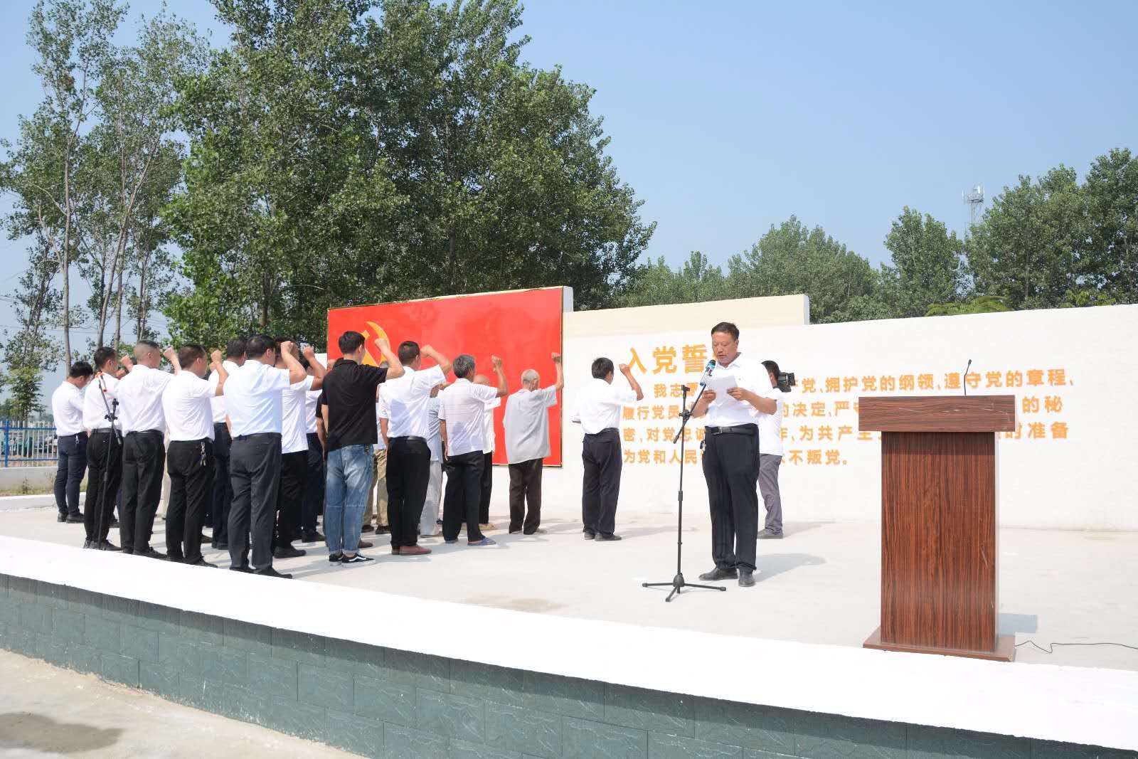 “我志愿加入中國共產(chǎn)黨,擁護(hù)黨的綱領(lǐng),遵守黨的章程……”升國旗儀式結(jié)束后,由紀(jì)莊支部書記李國喜領(lǐng)誓,全體黨員面對鮮紅黨旗,胸前佩戴黨徽,排著整齊的隊列,高高舉起右手,再次向黨作出了莊嚴(yán)地承諾,重溫入黨誓言,聲聲入耳,句句入心。