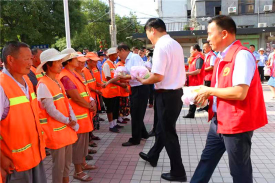 8月8日,扶溝縣政協(xié)主席張建中帶領(lǐng)縣政協(xié)委員和政協(xié)機(jī)關(guān)志愿者到縣城桐丘路視察文明城市創(chuàng)建工作,并看望慰問環(huán)衛(wèi)工人和城管工作人員??h政協(xié)常委田孟偉代表達(dá)理家居有限公司捐贈價(jià)值2萬余元防暑降溫用品,助力扶溝縣省級文明城市創(chuàng)建工作。