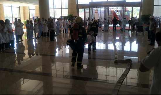 此次演練模擬一個蒙面歹徒在該縣六樓某科室打砸并故意縱火,轄區(qū)公安干警、消防指戰(zhàn)員及醫(yī)院保安力量迅速出動處置,防恐人員及時將犯罪分子制服,而此時醫(yī)院內火災迅速蔓延,多名醫(yī)護人員被困火場無法逃生,醫(yī)院負責人通過應急廣播進行人員疏散,消防指戰(zhàn)員按照預定應急處置方案迅速展開滅火救援行動。