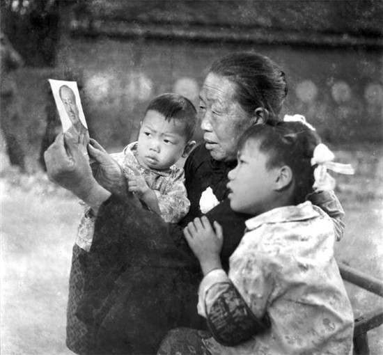 1976年9月,全國上下沉浸在毛主席逝世的悲痛中,老人為孩子戴上白布花,對(duì)著毛主席照片說心里話。