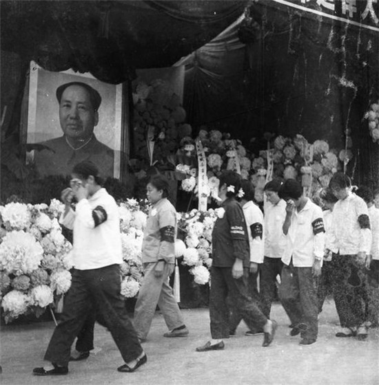 廣播喇叭一直轉(zhuǎn)播著中央人民廣播電臺(tái)的節(jié)目,哀樂一遍遍響起,回蕩在大街小巷、城鎮(zhèn)鄉(xiāng)村,大家不約而同地佩戴黑紗,自發(fā)做白花、扎花圈、寫挽聯(lián),商店里的白紙和黑布都賣缺了。機(jī)關(guān)單位的同志在自己布置起來的靈堂里悼念毛主席,學(xué)生每天上課之前都向毛主席默哀,工廠里掛起了“繼承毛主席遺志,抓革命、促生產(chǎn)”的橫幅,農(nóng)民佩戴著黑紗在田野里勞動(dòng)。