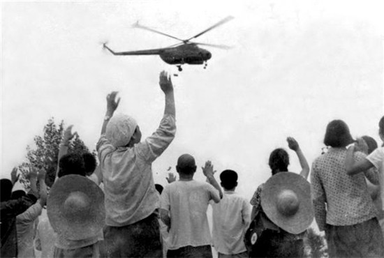 解放軍派出大量直升機(jī)空投救災(zāi)物資。 (圖片來源:李中華)