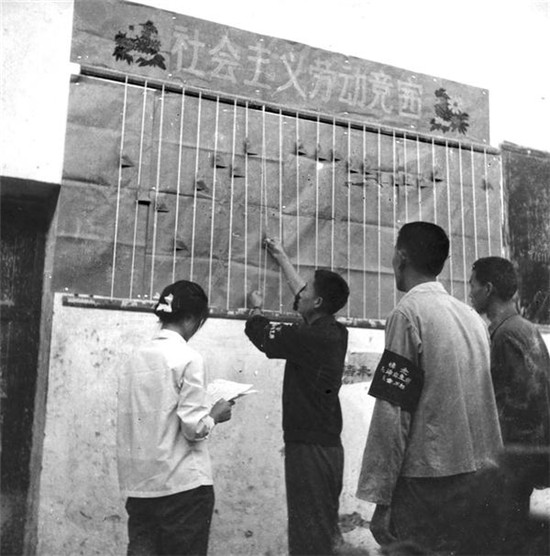 項(xiàng)城工人佩戴黑紗開展社會(huì)主義競賽。
