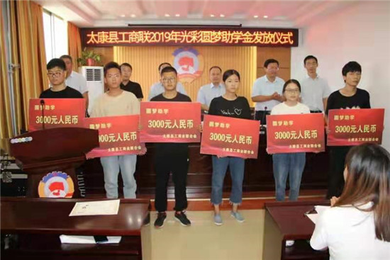 焦陽(yáng)光同志宣讀了太康縣工商聯(lián)《關(guān)于表彰2019年度“精準(zhǔn)扶貧˙光彩圓夢(mèng)”助學(xué)活動(dòng)中先進(jìn)單位及個(gè)人的決定》。授予河南通泰紡織有限公司等19家企業(yè)為2019年度“精準(zhǔn)扶貧˙光彩圓夢(mèng)”助學(xué)活動(dòng)“愛心企業(yè)”榮譽(yù)稱號(hào),授予太康縣鑫源鞋業(yè)有限公司薛華杰等45名同志為2019年度“精準(zhǔn)扶貧˙光彩圓夢(mèng)”助學(xué)活動(dòng)“愛心人士”榮譽(yù)稱號(hào)。張珍珍代表學(xué)生發(fā)言。四通鍋爐董事長(zhǎng)馮坤代表企業(yè)表示,只要有困難,四通鍋爐將不遺余力的進(jìn)行幫助,直到完成學(xué)業(yè)。
