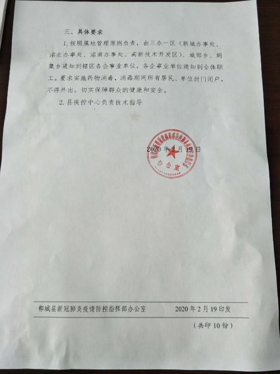 1.按照屬地管理原則負(fù)責(zé),由三辦一區(qū)(新城辦事處、洺北辦事處、洺南辦事處、高新技術(shù)開發(fā)區(qū))、城郊鄉(xiāng)、胡集鄉(xiāng)通知到轄區(qū)各企事業(yè)單位,各企事業(yè)單位通知到全體職工。要求實(shí)施藥物消毒,消毒期間所有居民、單位封門閉戶,不得外出。切實(shí)保障群眾的健康和安全。