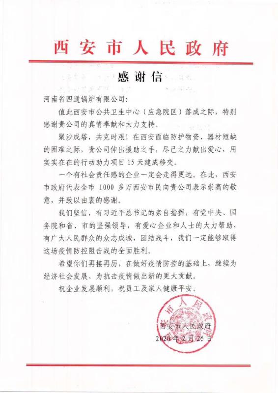 “聚沙成塔,共克時(shí)艱!在西安面臨防護(hù)物資、器材短缺的困難之際,貴公司伸出援助之手,盡己之力獻(xiàn)出愛心,在此西安市政府代表全市1000多萬西安市民向貴公司表示由衷的感謝”。這是西安市政府對(duì)太康縣拔尖人才、河南省四通鍋爐有限公司總經(jīng)理馮坤的感謝信。一方有難,八方支援。在新聞上了解到武漢新冠肺炎疫情突發(fā)的情況后,他連夜與中國(guó)紅十字會(huì)和武漢紅十字會(huì)取得聯(lián)系,詢問向新建的火神山醫(yī)院捐贈(zèng)醫(yī)用鍋爐和捐款事宜,通過網(wǎng)上銀行將30萬善款轉(zhuǎn)入武漢紅十字會(huì)賬戶中。