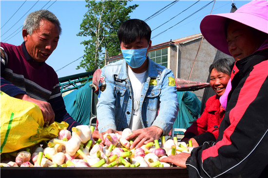 4月26日下午,記者在淮陽(yáng)縣王店鄉(xiāng)107國(guó)道沿線看到,各個(gè)大蒜的收購(gòu)點(diǎn)車來(lái)車往,蒜農(nóng)們拉著新蒜賣給小販們。盡管今年春季雨水較少,天旱土地墑情較差,但是上萬(wàn)畝大蒜,在蒜農(nóng)們施肥澆水管理下,長(zhǎng)勢(shì)不錯(cuò),每畝產(chǎn)量在3000斤到4000斤之間,迎來(lái)疫情下的大蒜豐收。