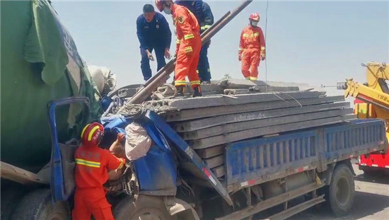 4月26日11時(shí)許,西華縣逍遙鎮(zhèn)加河灘村穎河橋發(fā)生一起車禍,一輛拉石板的貨車和一輛水泥罐車相撞,貨車在強(qiáng)大的慣性下車頭嚴(yán)重變形,司機(jī)被困車中,而貨車的駕駛室也被由于慣性發(fā)生前傾的石板壓住,情況十分緊急。周口市消防救援支隊(duì)西華縣消防大隊(duì)接到報(bào)警后立即出動(dòng)2車10人趕赴現(xiàn)場(chǎng)展開(kāi)救援。