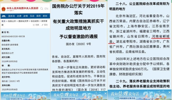 5月8日,中華人民共和國(guó)中央人民政府門(mén)戶網(wǎng)站發(fā)布《國(guó)務(wù)院辦公廳關(guān)于對(duì)2019年落實(shí)有關(guān)重大政策措施真抓實(shí)干成效明顯地方予以督查激勵(lì)的通報(bào)》國(guó)辦發(fā)〔2020〕9號(hào)文件,對(duì)213個(gè)地方予以督查激勵(lì),相應(yīng)采取30項(xiàng)獎(jiǎng)勵(lì)支持措施。其中,鄲城縣榮登“對(duì)公立醫(yī)院綜合改革成效較為明顯的地方”名錄,獲獎(jiǎng)500萬(wàn)元。