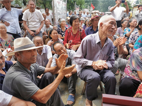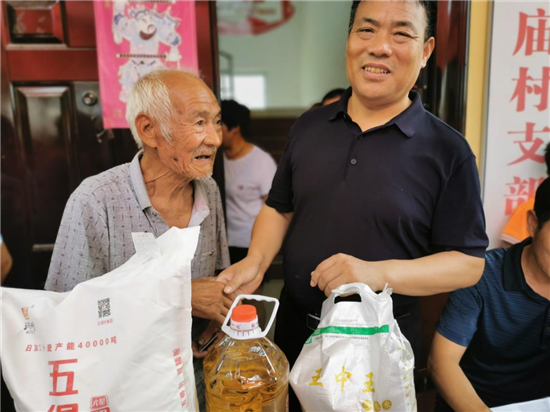發(fā)放儀式開始后,村干部負(fù)責(zé)發(fā)放,老人們有序領(lǐng)取,個個興高采烈,歡笑聲響徹在邵廟村的上空……