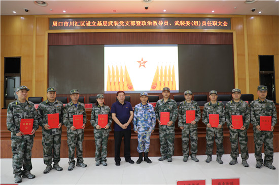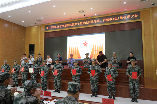 黨管武裝建設(shè)國(guó)防,軍民攜手共筑長(zhǎng)城。為健全武裝工作組織領(lǐng)導(dǎo)體系為推動(dòng)國(guó)防動(dòng)員和后備力量建設(shè)在基層末端落實(shí),7月16日上午,周口市川匯區(qū)召開(kāi)基層武裝黨支部暨政治教導(dǎo)員、武裝委(組)員任職大會(huì)。周口軍分區(qū)司令員湯維政,區(qū)委書(shū)記、區(qū)人武部黨委第一書(shū)記李宗喜,周口軍分區(qū)政治工作處主任李揚(yáng),市委組織部副處級(jí)調(diào)研員宋陽(yáng),區(qū)人武部政委高新傳、部長(zhǎng)陳繼芳及城鄉(xiāng)一體化示示范區(qū)、經(jīng)濟(jì)開(kāi)發(fā)區(qū)、港口物流產(chǎn)業(yè)聚集區(qū)等有關(guān)負(fù)責(zé)同志參加了大會(huì)。會(huì)上設(shè)立了18個(gè)基層武裝黨支部,任命了15名基層武裝部政治教導(dǎo)員、20名村(社區(qū))武裝委(組)員任職命令,武裝部政治教導(dǎo)員、武裝預(yù)建黨支部書(shū)記和兼職武裝委(組)員代表先后作了履職承諾發(fā)言,湯維政等為新任命的人員頒發(fā)了任職證書(shū)。