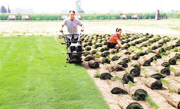 8月10日,扶溝縣韭園鎮(zhèn)小王莊村貧困戶閆新生、趙貞正在收割草坪。目前,小王莊村共發(fā)展草坪種植1100多畝,有30多戶建檔立卡貧困戶通過出租土地和管理草坪實現(xiàn)了穩(wěn)定收入,僅草坪一項戶均年收入可達4000元以上。谷志方 攝