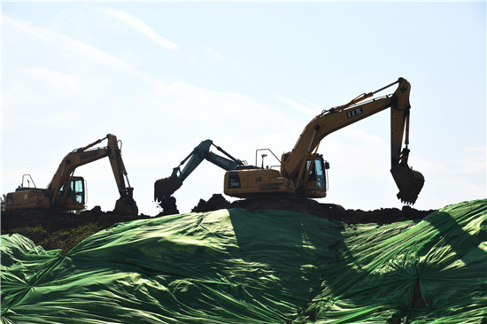 8月13日,在河南省周口市商水縣浩邦紡織年產(chǎn)12000噸高檔針織面料項目工地,工程機械正在開挖地基。