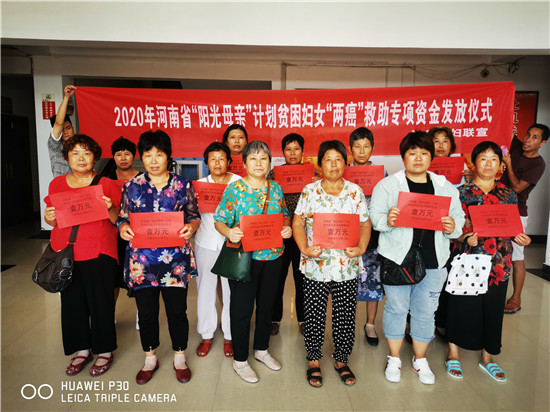 據(jù)悉,此次發(fā)放的公益金來自于河南省陽光母親貧困婦女兩癌救助金。其救助對象是經(jīng)過有檢查資質(zhì)的醫(yī)療機(jī)構(gòu)確診、患有宮頸癌ⅡB以上或浸潤型乳腺癌的農(nóng)村貧困婦女,救助標(biāo)準(zhǔn)為每人一次性救助1萬元。