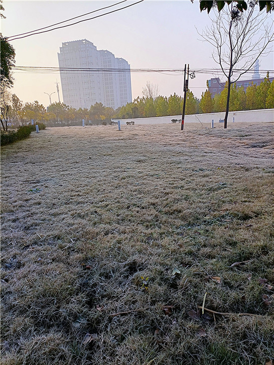 百草今何妝?茫茫著華霜。寒煙鎖素艷,疾步量路長(zhǎng)。12月4日早晨,我市下霜了,潔白的華霜就像一層薄紗,在陽光的映照下分外美麗。