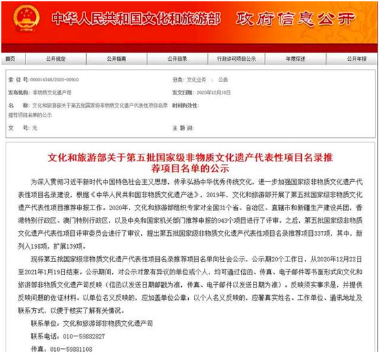 據(jù)了解,2019年,文化和旅游部開展了第五批國家級(jí)非物質(zhì)文化遺產(chǎn)代表性項(xiàng)目推薦申報(bào)工作。2020年,文化和旅游部組織專家對(duì)全國31個(gè)省、自治區(qū)、直轄市和新疆生產(chǎn)建設(shè)兵團(tuán),香港特別行政區(qū)、澳門特別行政區(qū),以及中央和國家機(jī)關(guān)部門推薦申報(bào)的943個(gè)項(xiàng)目進(jìn)行了評(píng)審。之后,第五批國家級(jí)非物質(zhì)文化遺產(chǎn)代表性項(xiàng)目評(píng)審委員會(huì)進(jìn)行了審議,提出第五批國家級(jí)非物質(zhì)文化遺產(chǎn)代表性項(xiàng)目名錄推薦項(xiàng)目337項(xiàng),其中,新列入198項(xiàng),擴(kuò)展139項(xiàng)。
