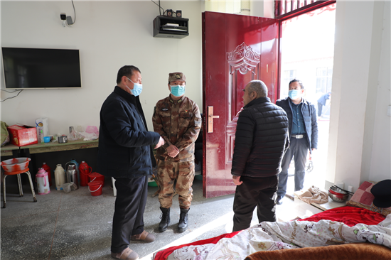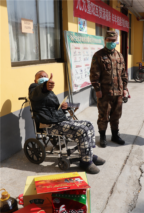 新橋鎮(zhèn)新兵楊凱入伍前和癱瘓的父親相依為命,市人武部領(lǐng)導(dǎo)協(xié)調(diào)地方政府,把其父親送到了新橋鎮(zhèn)敬老院公費養(yǎng)老,解除他的后顧之憂。春節(jié)到了,人武部領(lǐng)導(dǎo)還牽掛著這個特困家庭,矯百成帶隊來到新橋鎮(zhèn)敬老院。此時正值中午,楊凱的父親正坐在屋外的輪椅上曬太陽,見到矯部長的突然到來,激動的眼含熱淚,他緊緊握住矯百成的手久久不愿松開。矯百成噓寒問暖,給他送上1000元慰問金和生活必需品,楊凱的父親用他那不太清晰的語言表達(dá)對部長的真誠感謝。在敬老院院長的帶領(lǐng)下,矯百成又來到老人的住室察看起居情況,詢問他平時生活狀況,當(dāng)?shù)弥先松畹暮苁娣r,矯百成滿意的笑了。