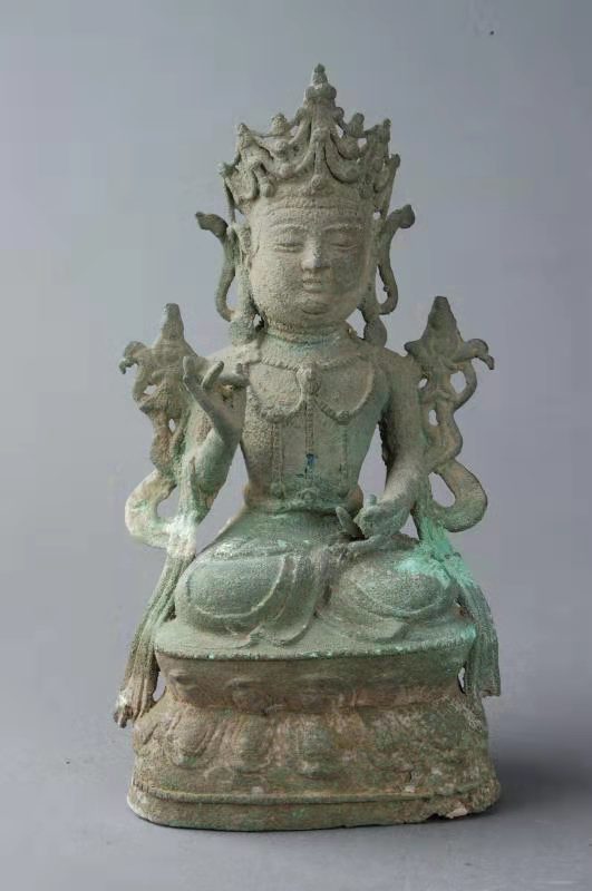 商水壽圣寺塔,高41.5米,為九級樓閣式磚塔。塔體從底至頂漸收勻稱,平面呈正六邊形。塔頂用鑄鐵鑄成葫蘆形寶頂,給人以挺拔雋秀之感。塔的層檐收放尺寸設計精妙,既保護了塔墻免遭雨雪侵蝕,又使塔體顯得莊重肅穆。塔身諸層外壁皆辟有圓券門、破子欞假窗,塔身各角砌出倚柱,檐下密布磚雕斗拱。塔內(nèi)砌出塔心室和盤旋梯道,可逐層登高至塔頂。塔第一層,南面辟門,門楣上刻“明道二年癸酉歲三月一日丙寅時戊寅日,葬舍利院主。僧□□建□□功德塔”。說明建塔的年代是北宋。塔室為穹窿頂。東南、西南兩壁有破子欞盲窗各1個,西壁另辟一拱券門,有踏道可登至第二層塔心室。第二層,南面辟門,東南、西南兩壁各砌一盲窗,東壁另辟一門可沿踏道進入第三層。以上諸層大同小異。第四層,塔心室內(nèi)北墻嵌石雕佛像3尊,兩尊盤膝正面像,一尊盤膝背面像。剎柱下端插入塔心室,上端置鐵質寶瓶,在不同部位還發(fā)現(xiàn)“風調雨順”“國泰民安”“周王千歲千千歲”“大明嘉靖二十八年九月吉日”“河南周府施舍西華小瑤集壽圣寺塔一座”等字樣,這些都說明了明代嘉靖年間,又重修了塔身。1998年9月,在維修該塔時,在天宮清理出明代銅佛像3尊,白釉瓷盤1只,白釉黑花瓷碗、白釉褐花瓷碗各1個,刻印大彌陀經(jīng)1卷。銅佛像高約20厘米,其中一尊有“嘉靖三十一年”字樣,這一時期的周王為周敬王朱在鋌,這說明嘉靖三十一年周敬王朱在鋌為祈福曾將這批器物和經(jīng)卷,置入了塔頂?shù)蔫F質寶瓶中。