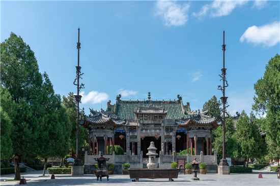 整個古建筑群為仿宮殿式,山門、鐵旗桿、石牌坊、碑亭、饗殿、大殿、河伯殿、炎帝殿、戲樓、拜殿、春秋閣由南向北,建于中軸線上,藥王殿、灶君殿和東廊房,財神殿、酒仙殿及西廊房在前院左右,東西看樓、東西配殿建在中院兩側(cè),老君殿、馬王殿、瘟神殿為東偏房,客房僧舍位于西院。是全國重點(diǎn)文物保護(hù)單位,國家AAAA級旅游景區(qū),國家三級博物館。