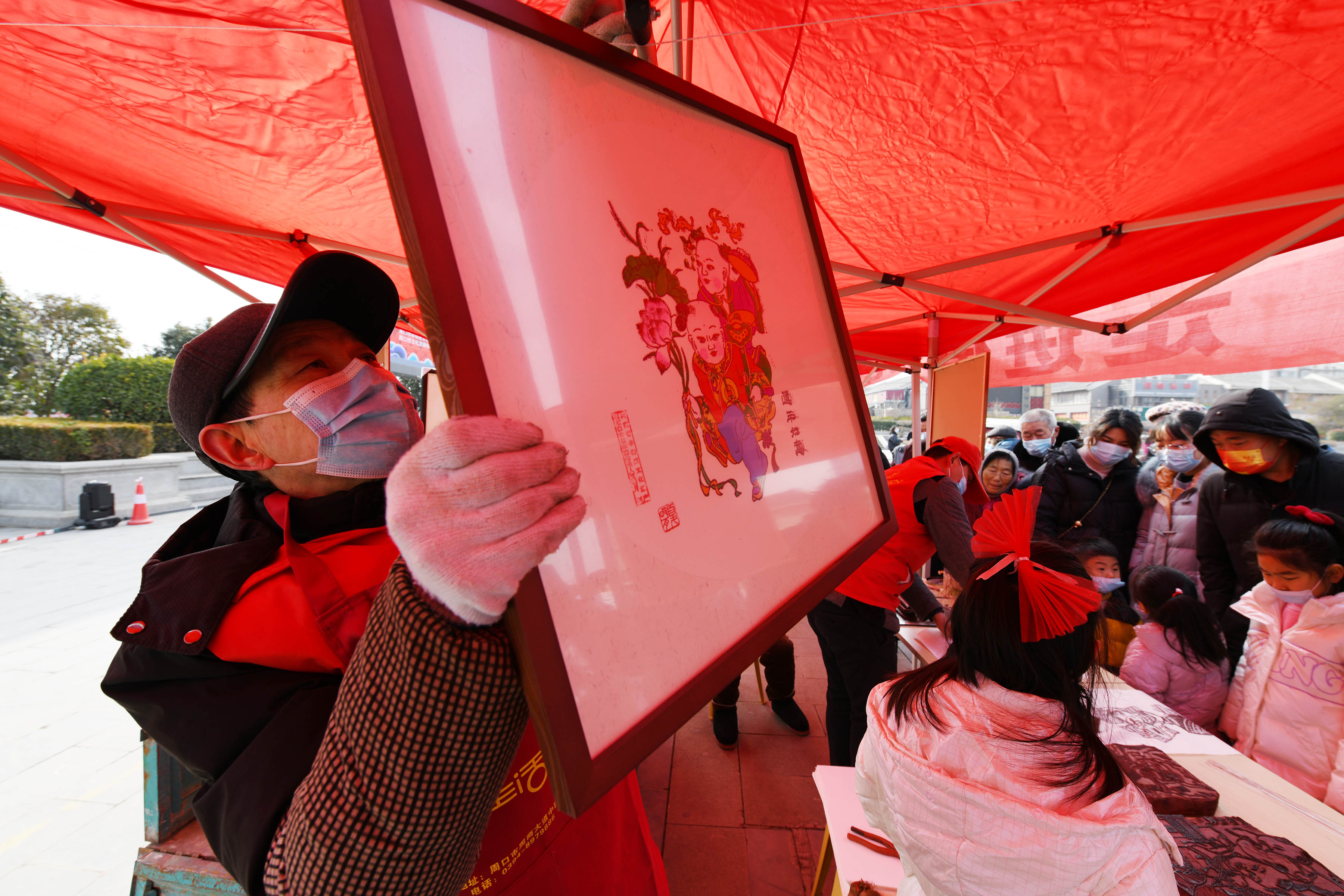 非遺傳承人穆廣科向市民展示木版年畫