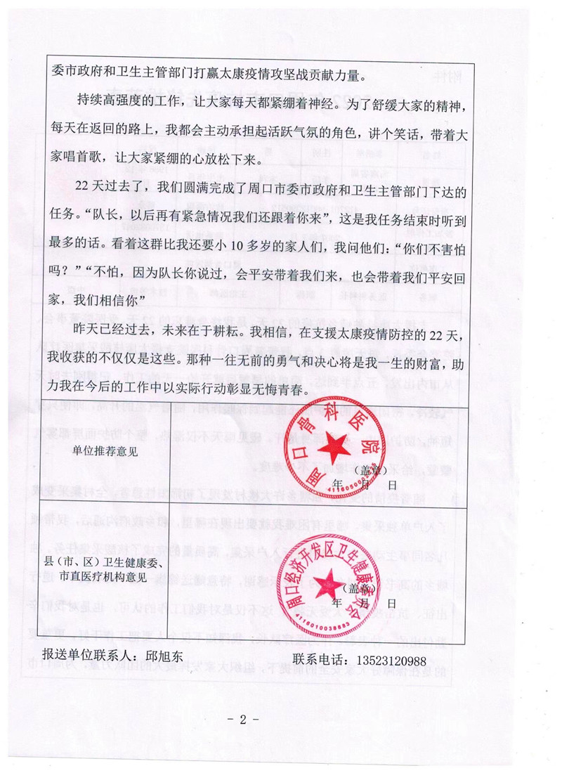 勤付出的一種表彰。作為醫(yī)療隊(duì)長,我深知,不僅個(gè)人要把工作干好,更重要的是在保障好大家安全的前提下,組織大家發(fā)揮最大的團(tuán)隊(duì)力量,為周口市委、市政府和衛(wèi)生主管部門打贏太康疫情攻堅(jiān)戰(zhàn)貢獻(xiàn)力量。