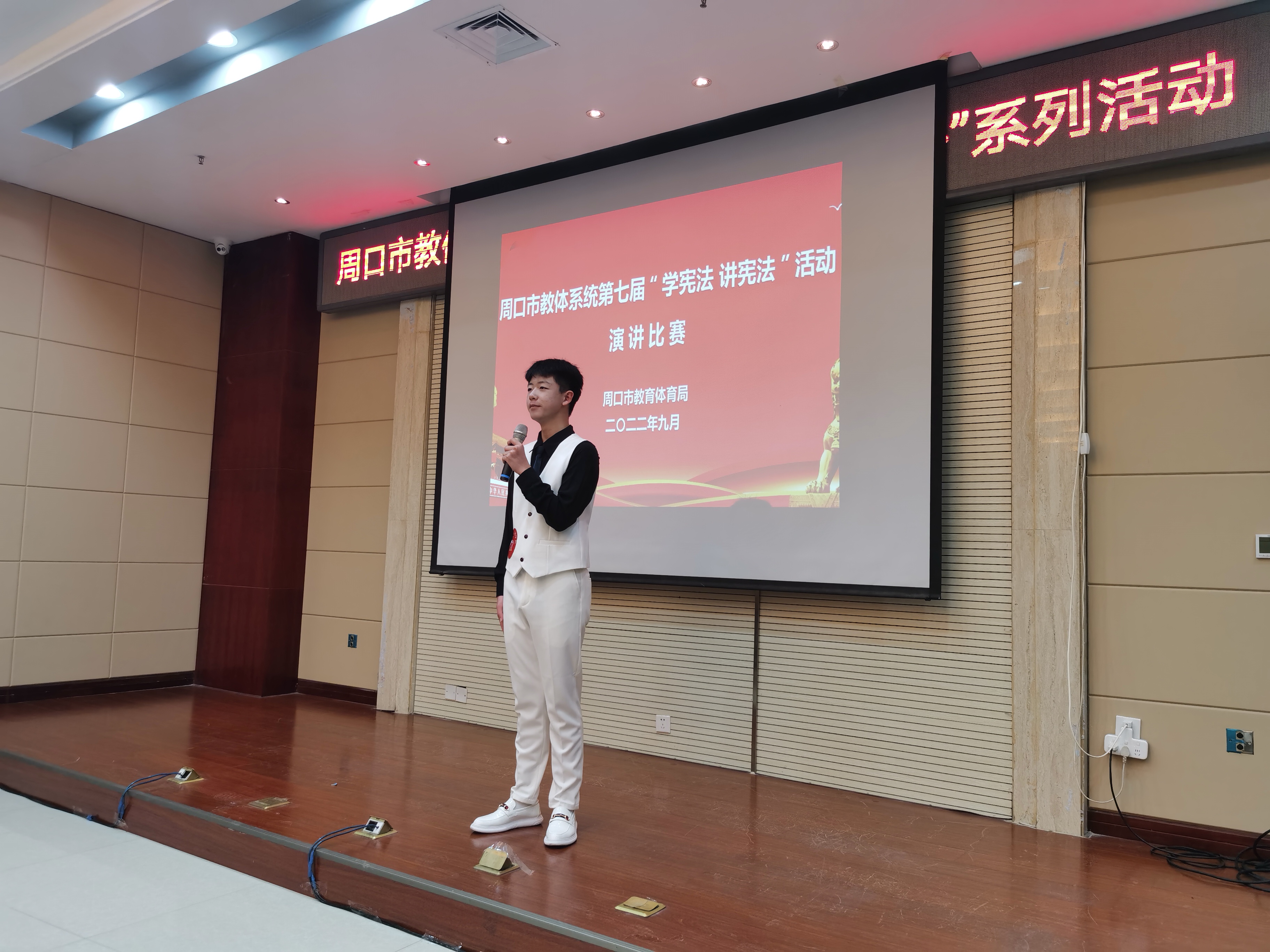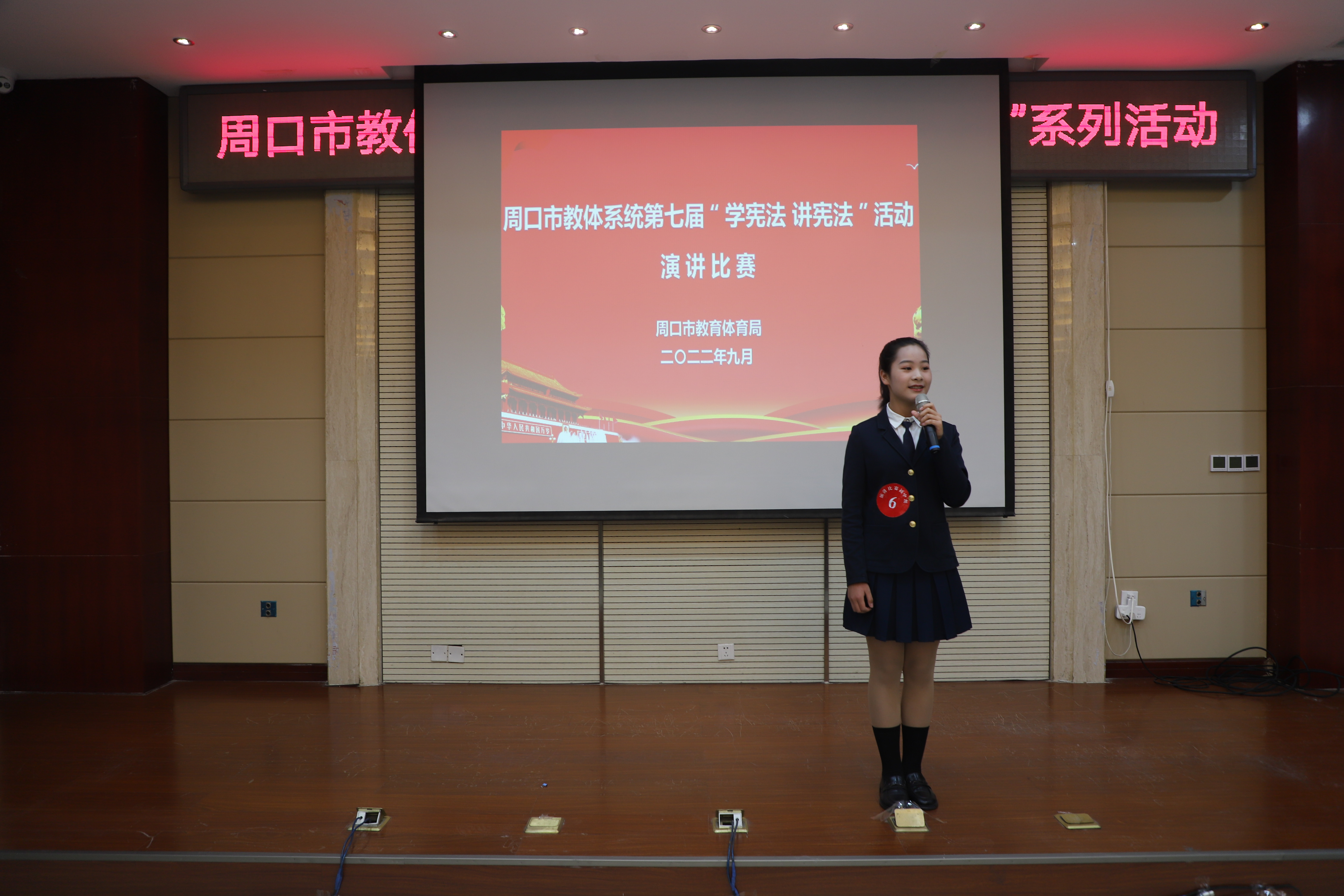 為進(jìn)一步弘揚(yáng)憲法精神,推進(jìn)廣大中小學(xué)生憲法學(xué)習(xí)教育活動,增強(qiáng)師生法治意識,豐富師生法治知識,9月21日,由周口市教體局主辦的第七屆中小學(xué)生“學(xué)憲法 講憲法”演講比賽和知識競賽舉行。