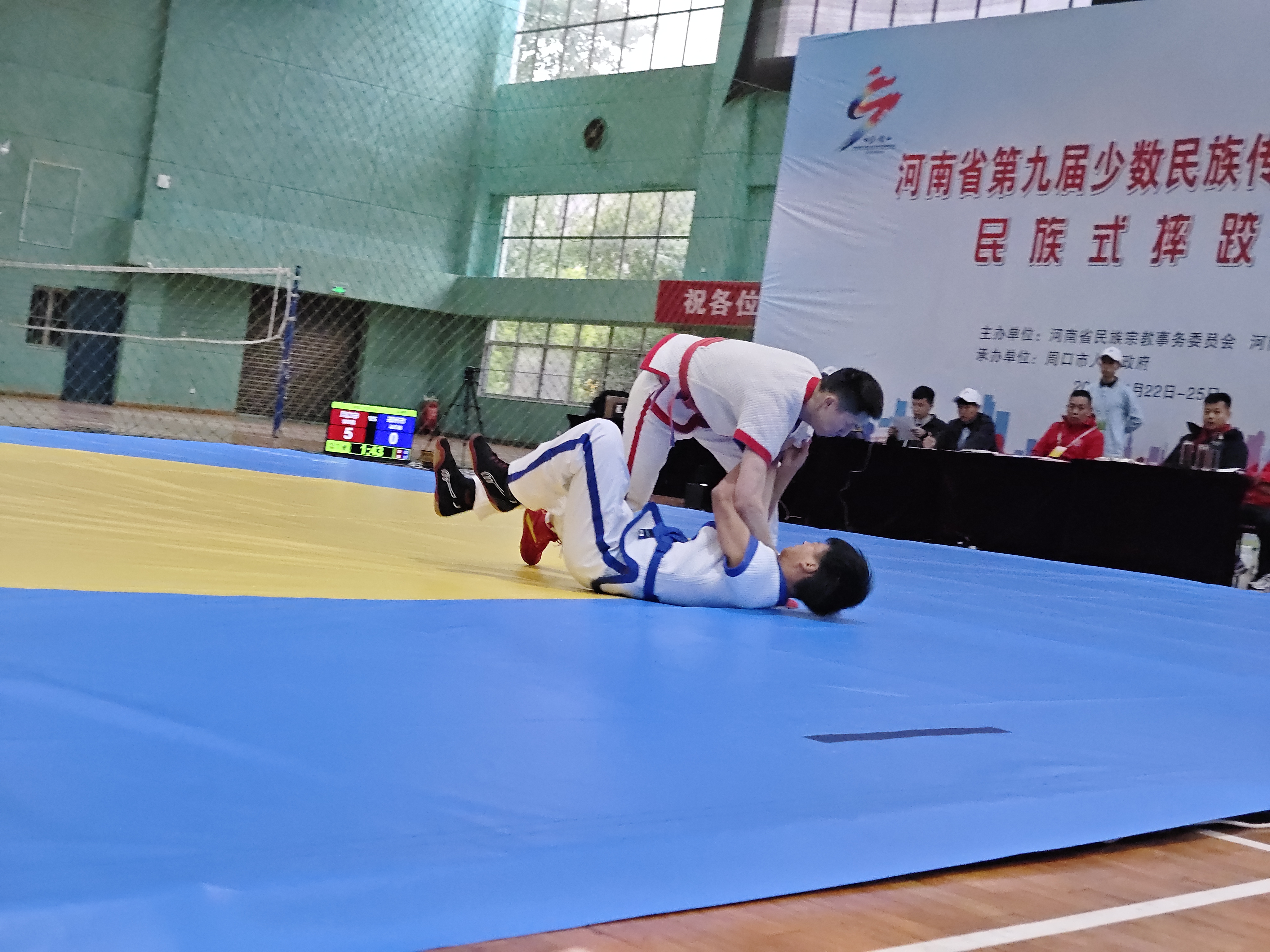 當日,河南省第九屆少數(shù)民族傳統(tǒng)體育運動會民族式摔跤競賽項目在周口師范學院老體育館開賽。絆跤是首個登場的跤種,9支代表隊參賽。該跤種以體重級別分組進行雙敗淘汰賽,共有52kg、62kg、74kg、87kg和87kg以上等5個公斤級,對應5個一等獎。經(jīng)過激烈角逐,來自漯河市、周口市和河南大學代表隊的5名選手獲得一等獎,我市選手李祥楷、劉小濤分別獲62kg、87kg一等獎。