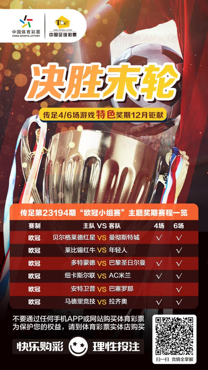 第23194期傳足特色獎期已經(jīng)于12月10日20:00開售,將于12月13日22:00停售,并于12月14日開獎。其中貝爾格萊德紅星VS曼徹斯特城、多特蒙德VS巴黎圣日爾曼、紐卡斯?fàn)柭?lián)VSAC米蘭和馬德里競技VS拉齊奧為4場進(jìn)球游戲競猜賽事。