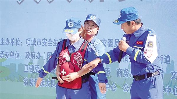 6月16日,項(xiàng)城市舉行“安全宣傳咨詢?nèi)铡被顒印;顒釉O(shè)置警示教育片展播、應(yīng)急技能演示、救援裝備展示、安全咨詢等環(huán)節(jié)。圖為項(xiàng)城應(yīng)急藍(lán)天救援隊(duì)3名隊(duì)員演示海姆立克急救法操作流程。