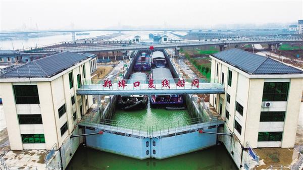 鄭埠口樞紐工程是沙潁河周口段關(guān)鍵性航運(yùn)樞紐工程。近年來(lái),通過(guò)航道疏浚、船閘擴(kuò)建等升級(jí)改造工程,鄭埠口樞紐通航能力顯著提升,為周口從“黃土經(jīng)濟(jì)”向“藍(lán)海經(jīng)濟(jì)”轉(zhuǎn)型提供了有力支撐。圖為從周口港出發(fā)的貨船等待通過(guò)鄭埠口復(fù)線船閘。